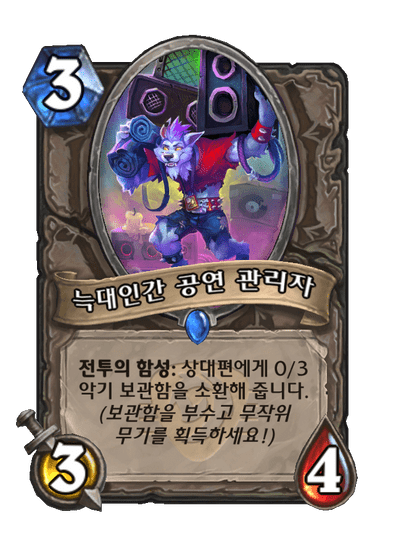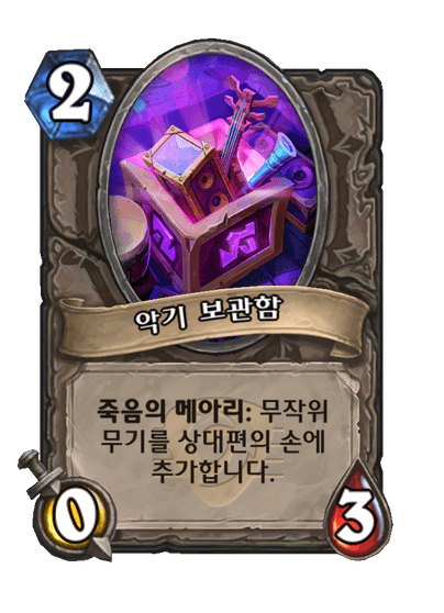 전투의 함성: 상대편에게 0/3 악기 보관함을 소환해 줍니다. (보관함을 부수고 무작위 무기를 획득하세요!)