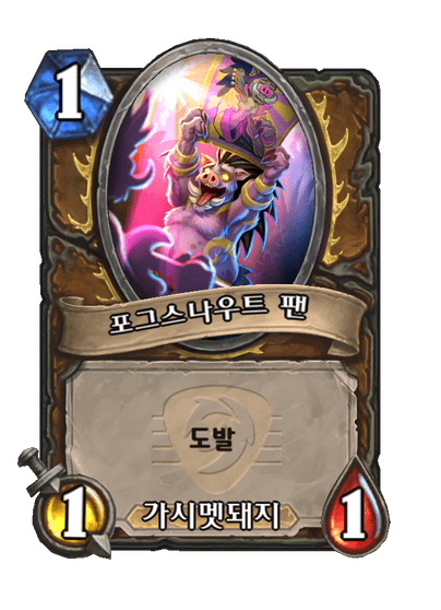 | 효과 | 전투의 함성: 도발 능력이 있는 / 가시멧돼지를 둘 소환합니다. (이번 턴에 내 영웅이 얻은 공격력과 방어도만큼 강화됩니다.) | ||
