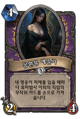 내 영웅이 피해를 입을 때마다 흑마법사 이외의 직업의 무작위 카드를 손으로 가져옵니다.