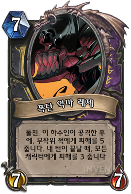 돌진. 이 하수인이 공격한 후에, 무작위 적에게 피해를 5 줍니다. 내 턴이 끝날 때, 모든 캐릭터에게 피해를 3 줍니다.