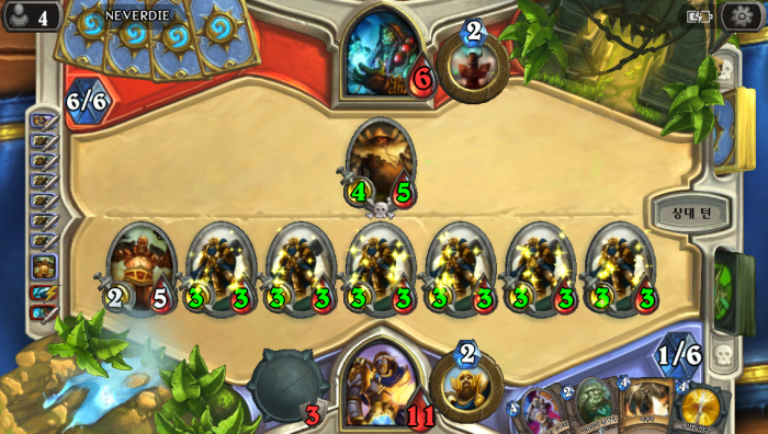 초반에는 명치보단 천보를 잘 활용하여 필드를 먹겠다는 생각으로 하수인 교환을 잘해주셔야 합니다 4턴안에 필드를 먹느냐 먹지 못하느냐가 노랑렉사르 극혐 소리 나오느냐 역시 짝퉁이냐를 좌우합니다.