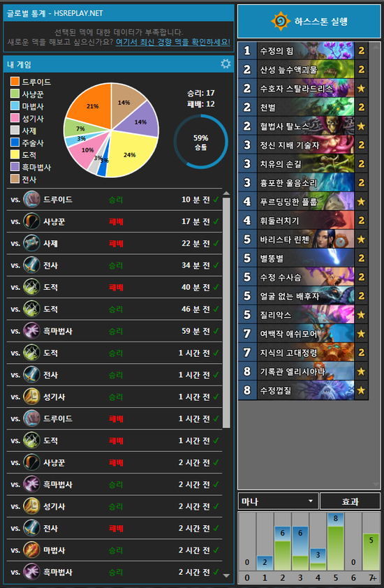 드루이드 이번 확팩 특성상 덱을 어떻게 땡기던 다른 직업보다 빨리 땡기게 되있어서 컨덱 상대로는 기록관으로 덱 갈아주면서 힐카드를 최대한 손에 많이 남겨놔서 이길 생각 하시면 됩니다.