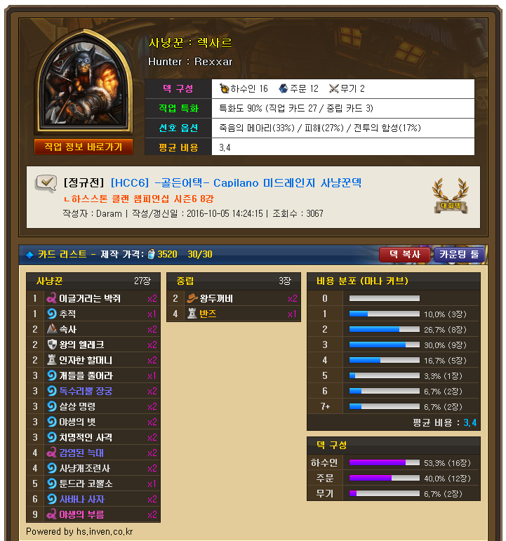 [하스돌] HCC/VSL 양대리그 사용 직업카드 27장 미드레인지 사냥꾼