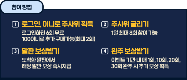 - 초기화 시 최대 8번: 무료 주사위 6개 + 이니 구매 주사위 2개 (100 이니)