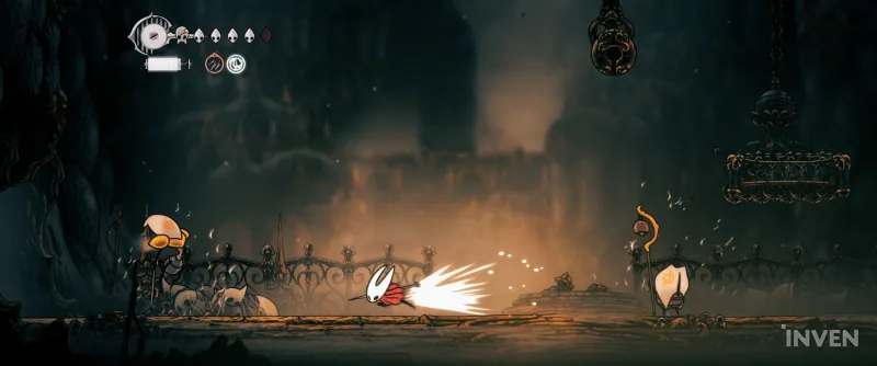 이것도 문제인데 더 큰 문제는 따로 있습니다. 바로 점프 하단 공격을 이용해 통과해야 하는 플랫포머 구간입니다. 어느 정도 게임을 진행해서 사신 문장이나 방랑자 문장을 얻었다면 그나마 쉽게 통과할 수 있을 테지만, 그것도 어디까지나 어느 정도 게임을 진행했을 때의 이야기입니다. '실크송'에서는 초반부터 이런 점프 플랫포머 구간이 꽤 빈번하게 나옵니다. 문제는 그걸 사냥꾼 문장으로 통과해야 한다는 점이죠. 대각선으로 공격하기에 이 각도를 맞추는 게 초반에는 여간 어려운 게 아닙니다.