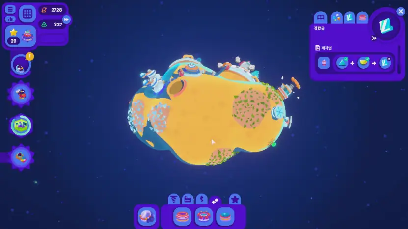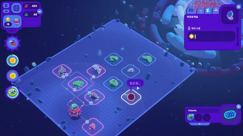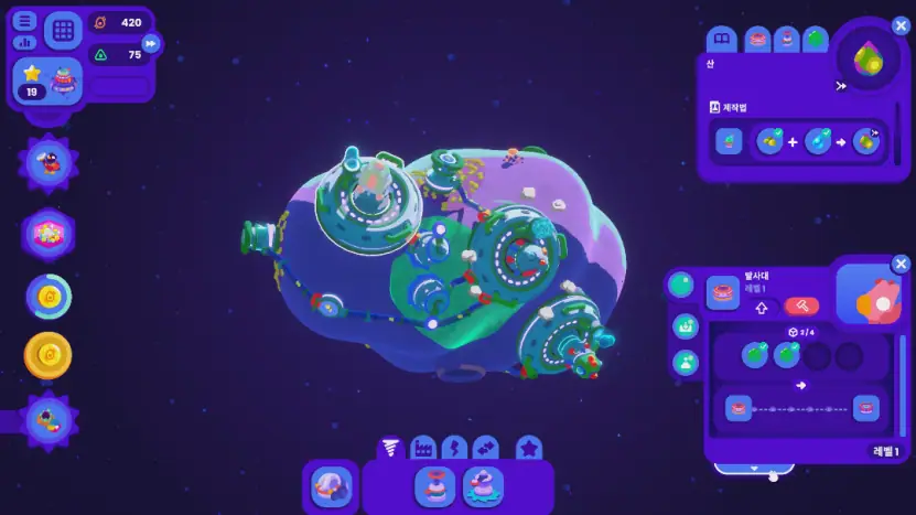 통상 이런 건설 게임들은 설비가 있는 구역을 클릭하면 각종 사항들이 텍스트나 그래프 등으로 시각화되어 있지만, '스타버드'는 이런 요소들이 없습니다. 우주 기지의 레벨이나 현재 우주 기지에 설치된 설비, 각 자원의 시간당 총 생산량은 기지창에서 볼 수 있긴 한데, 그 생산 과정의 파이프라인은 소행성 사이사이의 이동 경로 그리고 소행성 내부에서 생기는 아이콘들만 보고 유저들이 짚어나가게끔 했습니다.