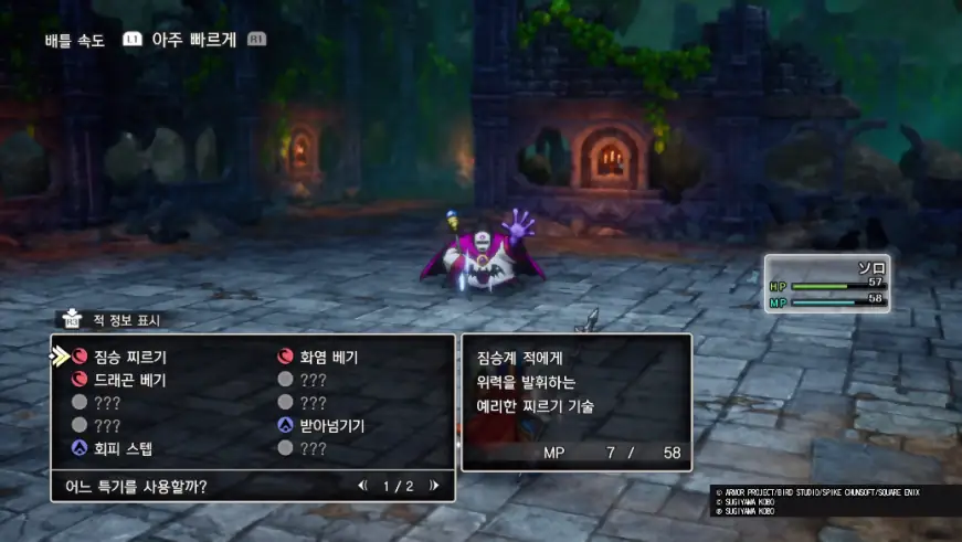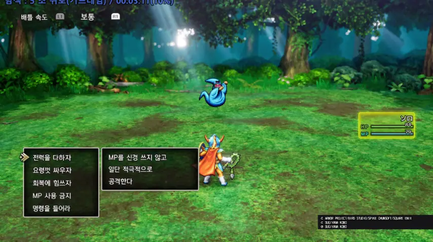 그래픽에서 고전의 감성을 현대에도 받아들일 수 있게 잘 소화해냈다면, 이제 그 내실이 어떤지도 살펴봐야 할 겁니다. 이미 스퀘어에닉스는 드래곤 퀘스트3 리메이크에서 모범 답안을 한 차례 낸 적 있습니다. 3단계의 배속 플레이에, 적 유닛 그룹을 선택해서 공격할 수 있는 시스템을 구축해 고전의 느린 템포를 현대에 맞춰 빠르게 끌어올렸죠.