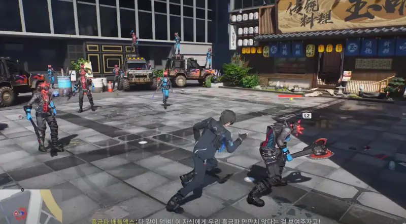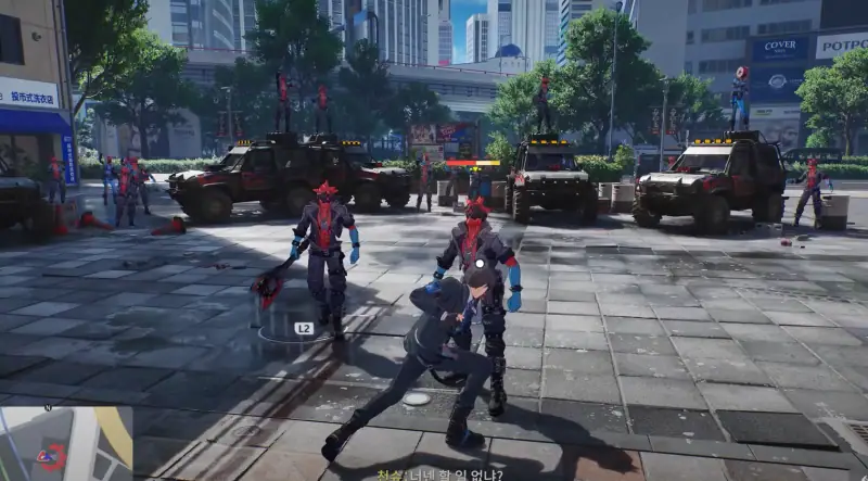 시연은 메인 스토리를 따라가는 스토리 모드와 여러 캐릭터를 골라서 도시를 탐험하는 자유 탐험 모드 2개로 구분됐다. 먼저 했던 건 메인 스토리 모드다. 스토리 모드는 주인공 천슈 아침 댓바람부터 쳐들어온 무법자들을 상대하면서 시작된다. 이 단계에서는 게임에 대한 기본적인 전투 시스템을 체험할 수 있다. 일단 이 파트에서 긍정적인 부분이라고 한다면 게임의 그래픽과 전투 시스템의 완성도가 상당히 높다는 점을 꼽을 수 있다.