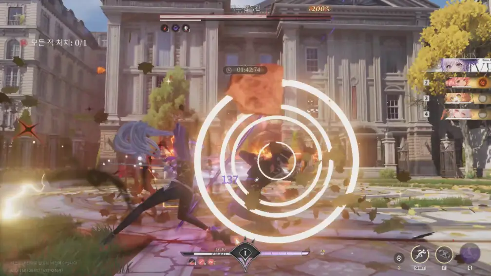 '실버 팰리스' 전투의 핵심은 '패링'입니다. 타 오픈월드 게임의 액션은 대체로 저스트 회피로 이득을 버는 시스템이지만, '실버 팰리스'는 적에게 노란 원이 뜨는 타이밍에 맞춰서 회피를 누르면 패링이 발동하죠. 그렇게 패링을 하고 난 뒤 추격해서 추가타를 넣으면서 일종의 교체기인 기습기를 발동할 리액터 게이지를 모은 뒤, 교체해서 또 콤보를 이어가다가 그로기 게이지가 차면 처형기를 먹이는 것이 '실버 팰리스'의 전투 템포입니다.