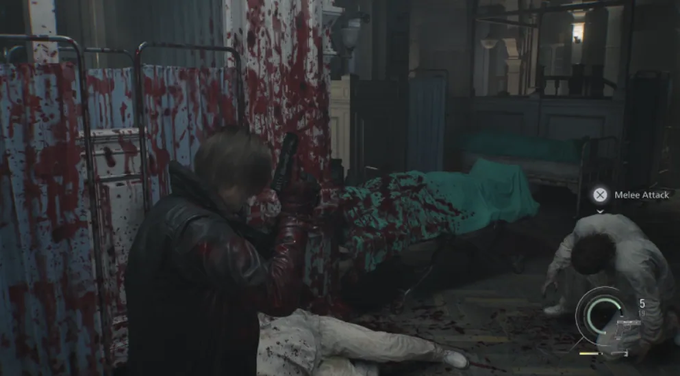 본 작품의 레온 파트는 그간 바이오하자드 시리즈 중에서도 가장 발전한 체술과 액션으로 무장했다는 느낌을 준다. 바이오하자드5에서 크리스가 보여준 핵주먹 만큼 직관적이진 않지만, 비틀거리는 좀비의 머리를 잡고 창틀에 후려치거나, 벽으로 밀친 뒤 발로 머리를 깨부수는 장면, 손도끼를 이용해 전기톱을 패링하는 것은 거의 액션 히어로 그 자체라고 할 수 있겠다.