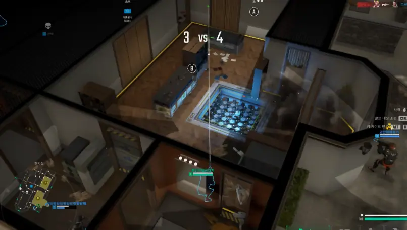 그리고, 이 모든 행위가 게임 내에서 가능한 건, 기본적으로 '레인보우식스: 시즈'가 3D 슈터이기 때문이다. 하지만 블라인드스팟 또한 수비팀과 공격팀이 5:5로 나누어 진행하는 택티컬 슈터다. 거기에 탑 다운 뷰를 곁들인.