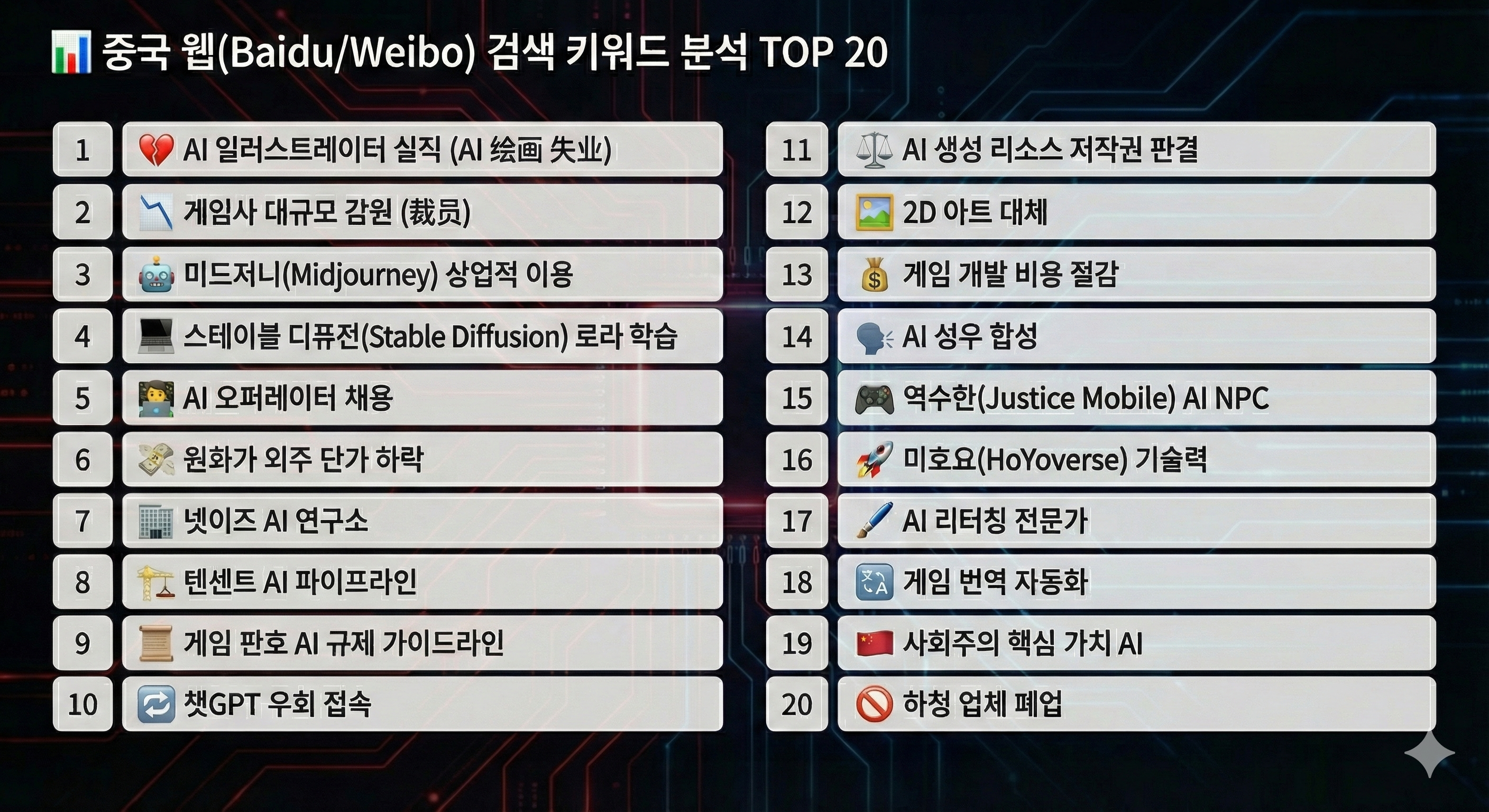 중국 게임 시장에서 AI는 더 이상 먼 미래의 기술이나 선택지가 아니다. 이미 노동 시장을 강타해 수많은 개발자와 아티스트가 생존을 위협받고 있다. 검색 데이터는 중국 업계가 '효율'이라는 명분 아래 얼마나 빠르게 '인간의 노동'을 대체하고 있는지 보여준다. 중국의 게임 개발 현장은 AI 도입 전과 후로 나뉜다고 해도 과언이 아닐 정도로 급격한 지각 변동을 겪고 있다.