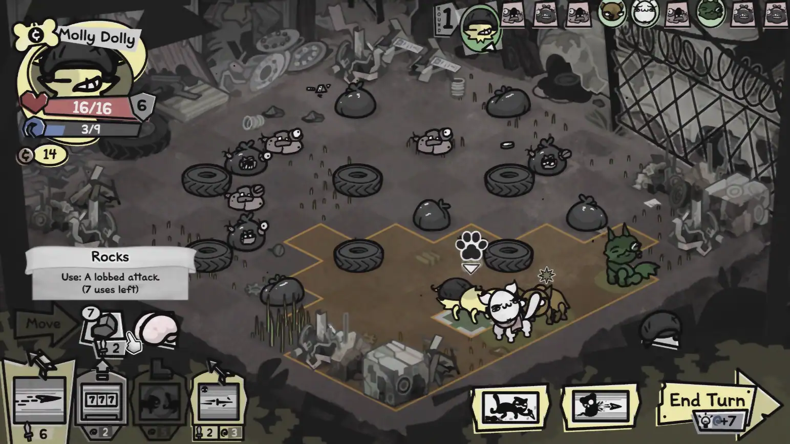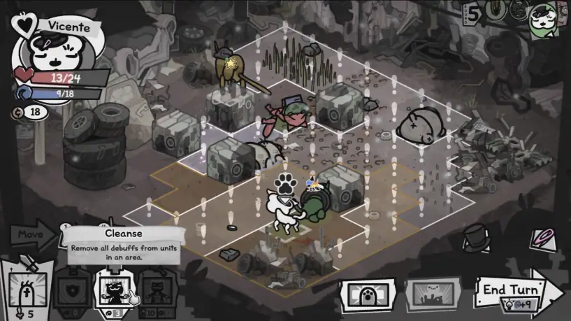 그렇기 때문에 뮤제닉스처럼, 네 명의 고양이가 뭔가 탐탁지 않은 이유로 모험을 떠나는 과정에 SRPG를 도입한 게 조금은 괴이하게 느껴지긴 했다. 심지어 스킬들도 침을 탁 뱉거나 용변을 누는 등 추잡한 행동들이 연달아 이어져서 처음에는 블랙 유머만 내세운 인상이 짙었다. 특히 SRPG는 캐릭터가 어느 정도 성장하기 전까지는 기물을 움직인 뒤 너 한 방 나 한 방식 정직한 교환이 루즈하게 일어나는 장르인 만큼, 그 진가를 처음부터 알아보기는 어려웠다.