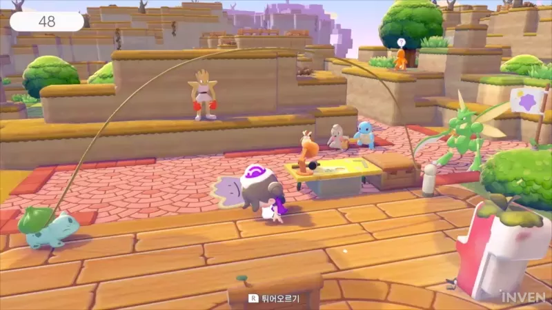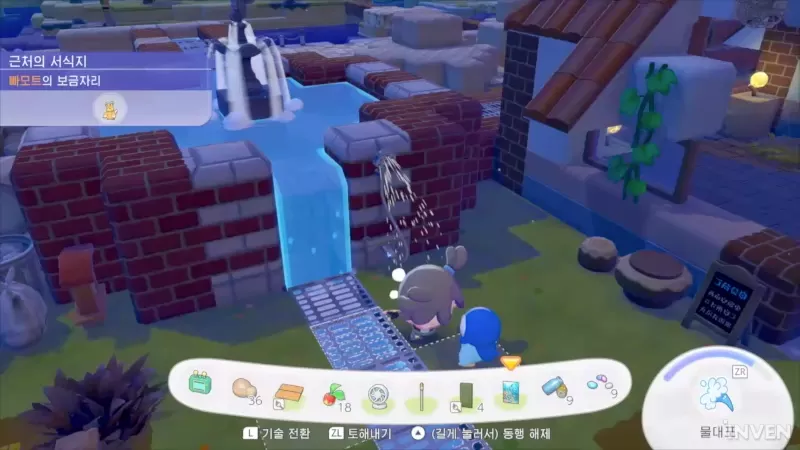 이 근간 위에 덮이는 게 포켓몬 IP, 그리고 동물의 숲이다. 특히나 포켓몬은 단순히 기존 게임에 덧입혀지는 스킨 정도로 그치지 않는다. 오히려 게임 디자인을 더욱 특별하게 만드는 장치로서 활용된다. 주인공 메타몽은 게임 초반 인간으로 변한 존재, 인간이 남겨놓은 약간의 도구를 활용할 수 있는 존재 정도에 그친다. 하지만 포켓몬들의 능력을 하나씩 흡수하면서 세계를 변화시킬 중요한 존재가 된다.