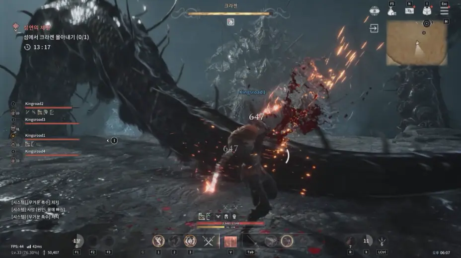 페이즈5에서는 여태까지 나왔던 패턴이 전부 다 활용됐다. 크라켄의 촉수와 먹물 맹공을 피하는 한편, 기름통을 던져서 필드를 불바다로 만드는 걸 저지하기 위해 파티원 중 한 명이 망루에 있는 발리스타로 촉수를 쏘는 등 대응이 필요했다. 기름통을 떨어뜨리면 크라켄이 잠시 그로기 상태가 되어서 뭍 위로 머리를 내놓는데, 이때 최대한 딜을 우겨넣는 것이 빠른 클리어의 지름길이었다. 그리고 체력을 다 깎은 뒤에는 크라켄 뒤에 있는 배에 적재된 기름통을 얼마나 빨리 저격하느냐가 클리어 타임 단축의 핵심이었다.